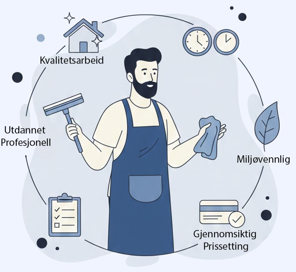 Vårt team består av erfarne og fullt utdannede rengjøringsmedarbeidere som spesialiserer seg på å levere høykvalitets rengjøringstjenester med fokus på detaljer og profesjonalitet.